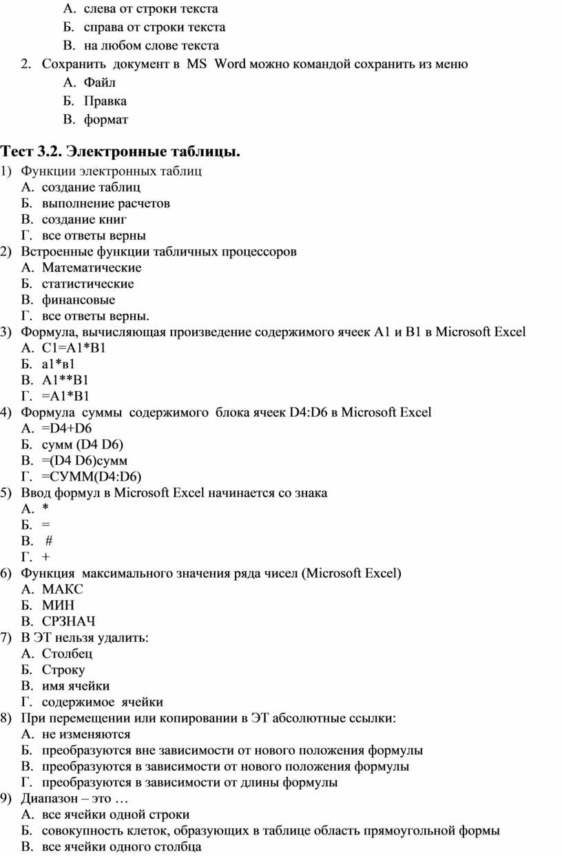 Тест 3.2. Электронные таблицы.