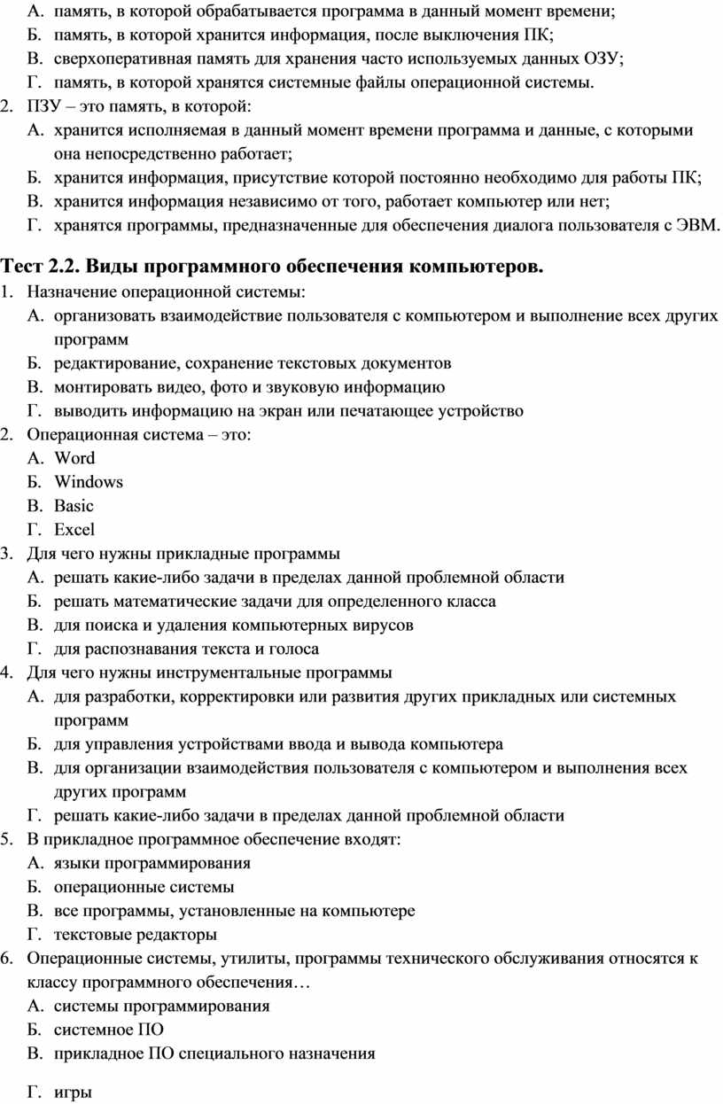 Тест 2.2. Виды программного обеспечения компьютеров.