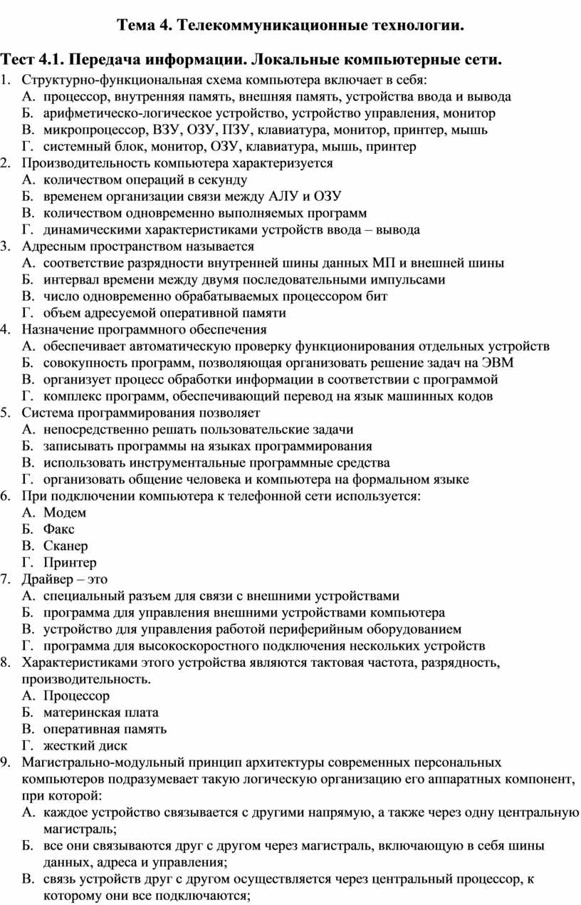 Тест 4.1. Передача информации. Локальные компьютерные сети.