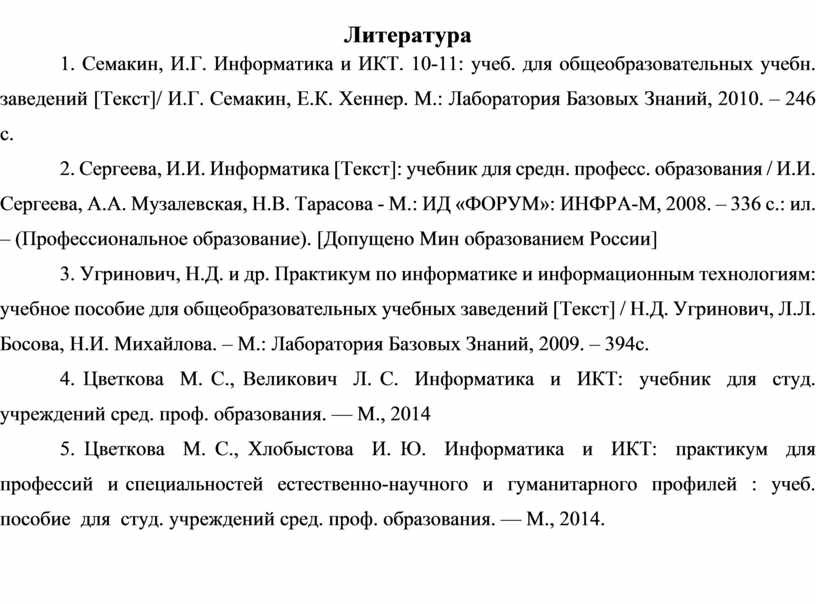 5. Цветкова М. С., Хлобыстова И. Ю. Информатика и ИКТ: практикум для профессий и специальностей естественно-научного и гуманитарного профилей : учеб. пособие для студ. учреждений сред. проф. образования. — М., 2014.