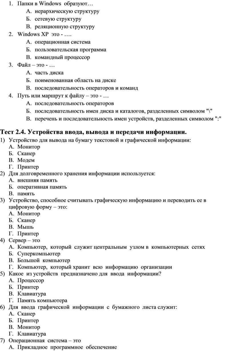 Тест 2.4. Устройства ввода, вывода и передачи информации.