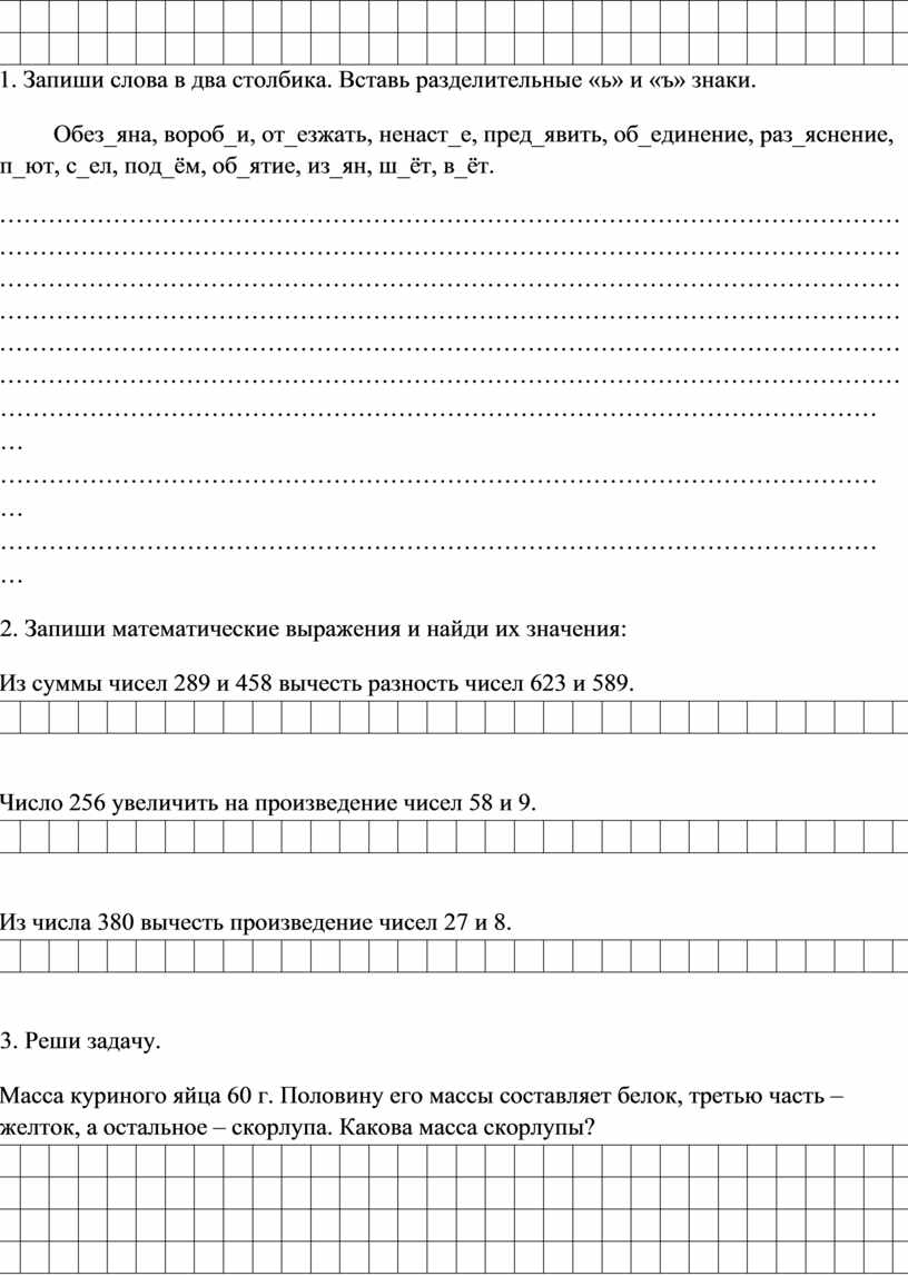 1. Запиши слова в два столбика. Вставь разделительные «ь» и «ъ» знаки.