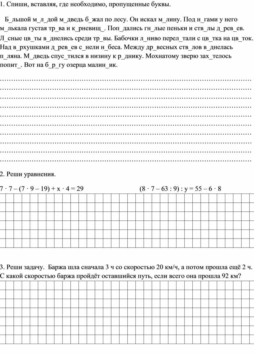 3. Реши задачу. Баржа шла сначала 3 ч со скоростью 20 км/ч, а потом прошла ещё 2 ч. С какой скоростью баржа пройдёт оставшийся путь, если всего она прошла 92 км?