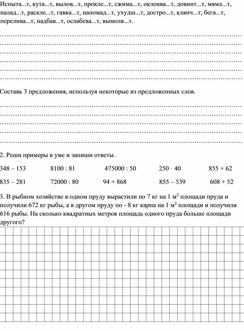 3. В рыбном хозяйстве в одном пруду вырастили по 7 кг на 1 м2 площади пруда и получили 672 кг рыбы, а в другом пруду по - 8 кг карпа на 1 м2 площади и получили 616 рыбы. На сколько квадратных метров площадь одного пруда больше площади другого?
