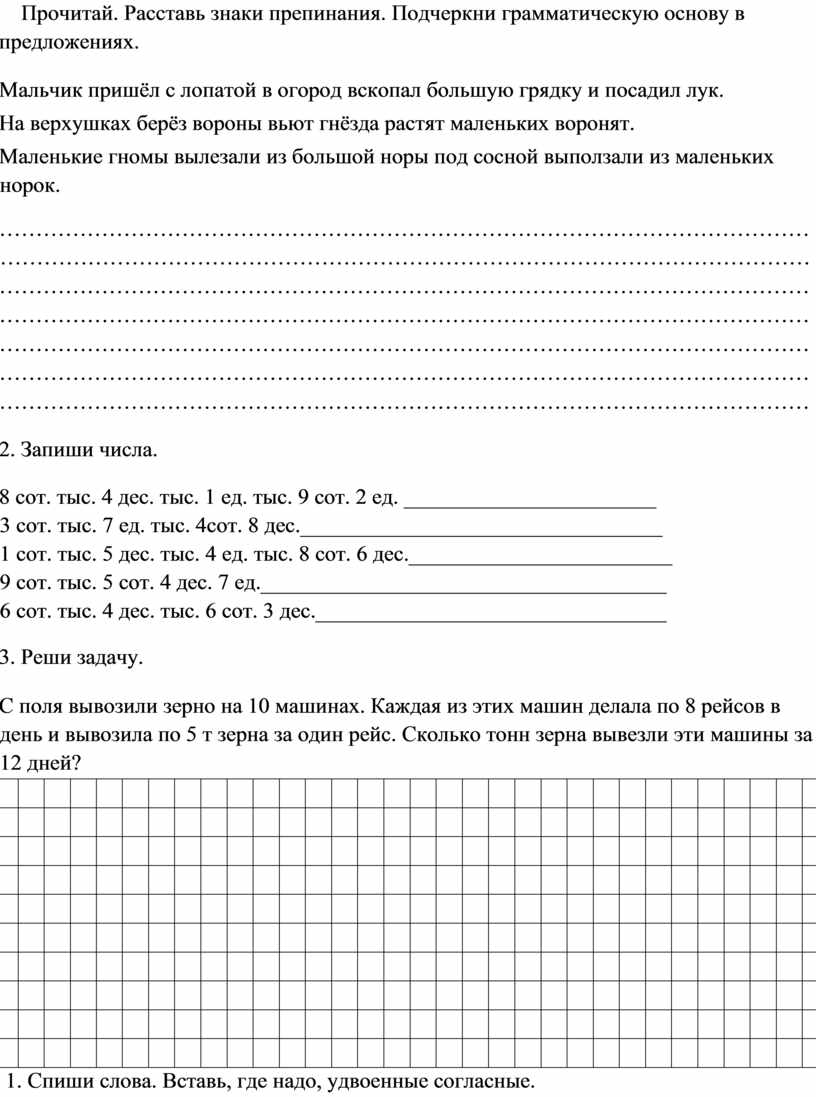 Прочитай. Расставь знаки препинания. Подчеркни грамматическую основу в предложениях.