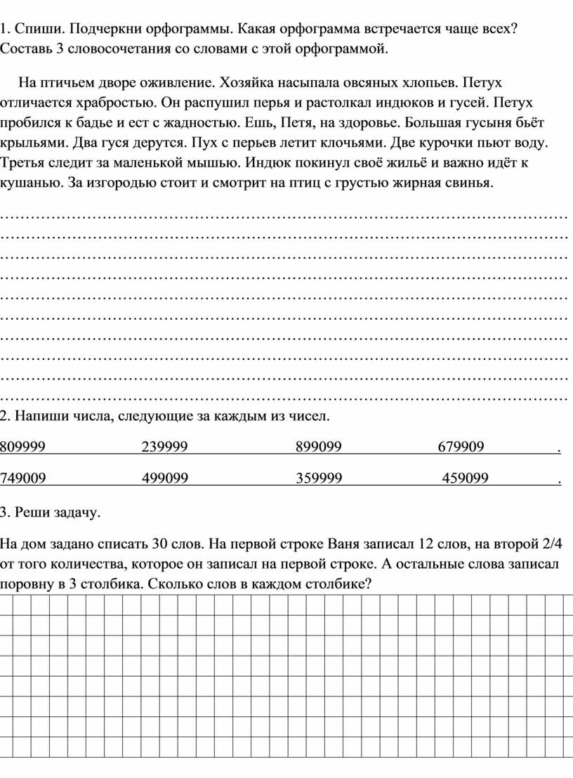 1. Спиши. Подчеркни орфограммы. Какая орфограмма встречается чаще всех? Составь 3 словосочетания со словами с этой орфограммой.