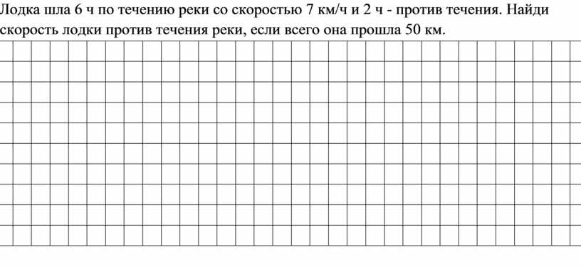 Лодка шла 6 ч по течению реки со скоростью 7 км/ч и 2 ч - против течения. Найди скорость лодки против течения реки, если всего она прошла 50 км.