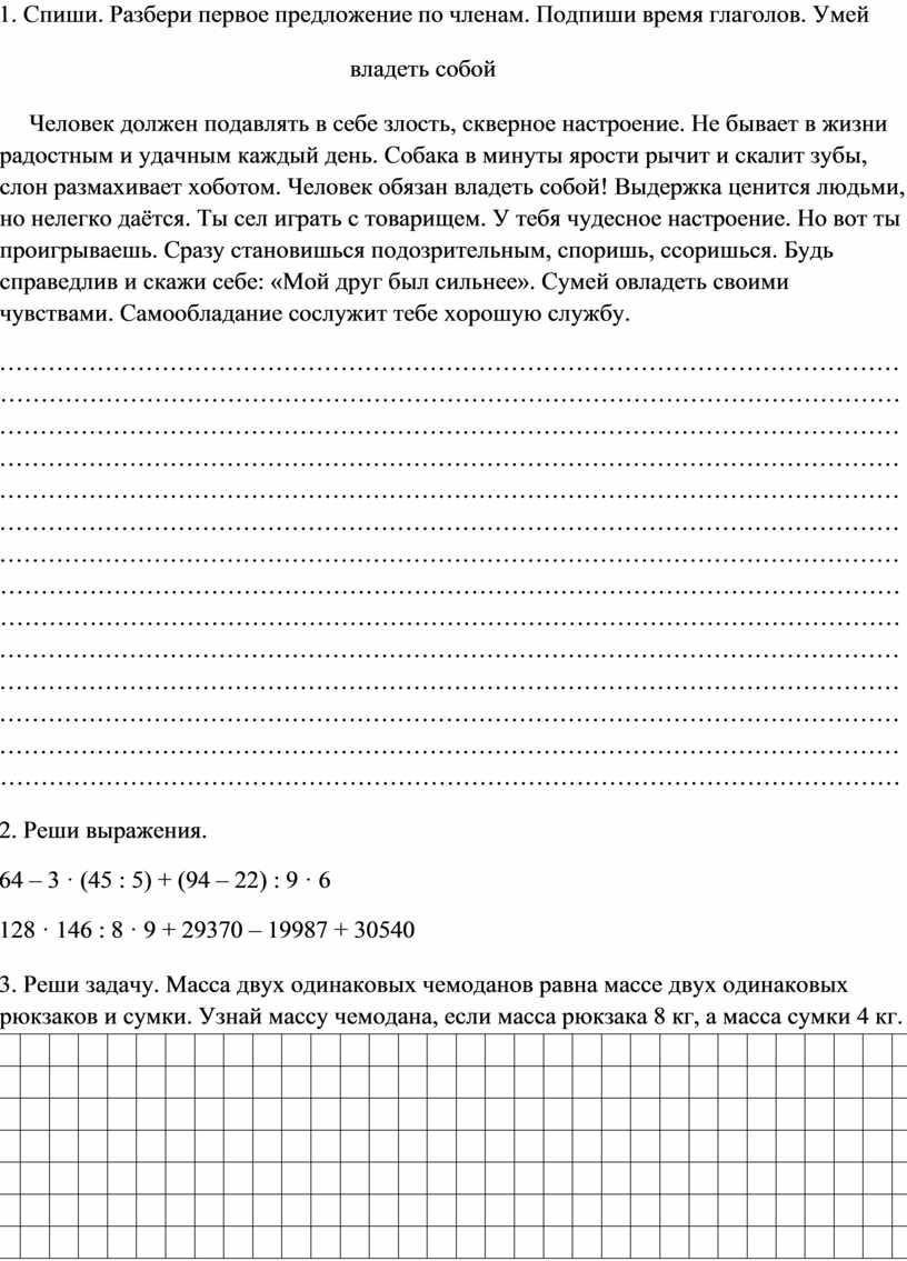 3. Реши задачу. Масса двух одинаковых чемоданов равна массе двух одинаковых рюкзаков и сумки. Узнай массу чемодана, если масса рюкзака 8 кг, а масса сумки 4 кг.