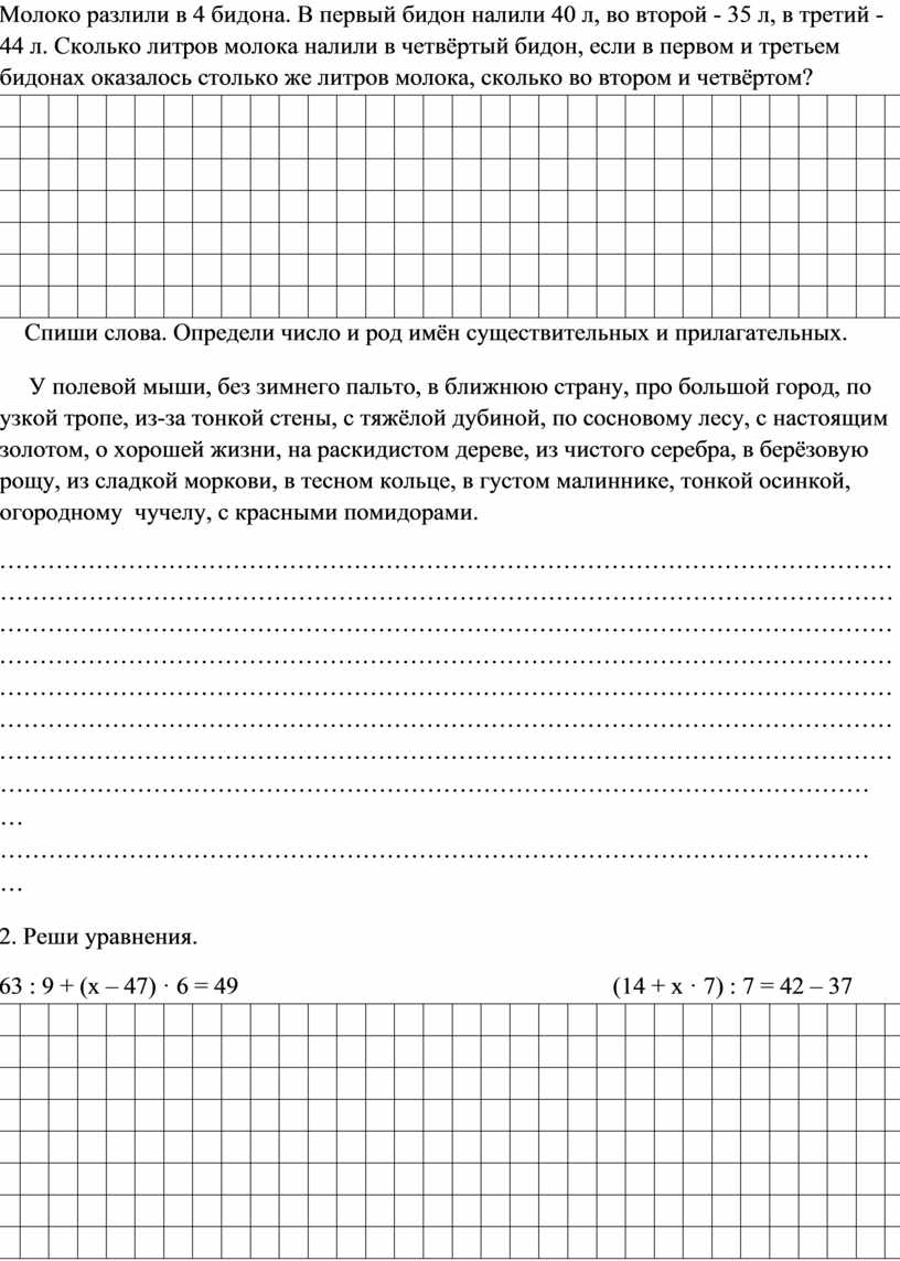 Молоко разлили в 4 бидона. В первый бидон налили 40 л, во второй - 35 л, в третий - 44 л. Сколько литров молока налили в четвёртый бидон, если в первом и третьем бидонах оказалось столько же литров молока, сколько во втором и четвёртом?