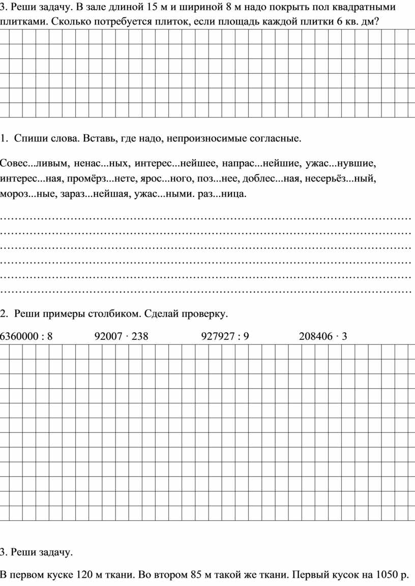 3. Реши задачу. В зале длиной 15 м и шириной 8 м надо покрыть пол квадратными плитками. Сколько потребуется плиток, если площадь каждой плитки 6 кв. дм?