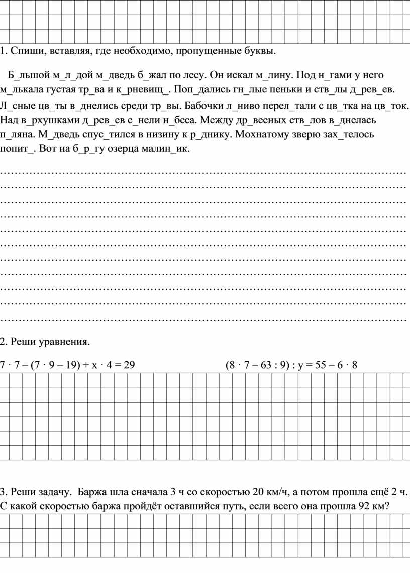 3. Реши задачу. Баржа шла сначала 3 ч со скоростью 20 км/ч, а потом прошла ещё 2 ч. С какой скоростью баржа пройдёт оставшийся путь, если всего она прошла 92 км?
