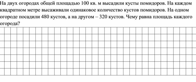 На двух огородах общей площадью 100 кв. м высадили кусты помидоров. На каждом квадратном метре высаживали одинаковое количество кустов помидоров. На одном огороде посадили 480 кустов, а на другом – 320 кустов. Чему равна площадь каждого огорода?