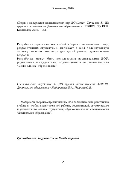 Разработка представляет собой сборник пальчиковых игр, разработанных студентами. Включает в себя пояснительную записку, пальчиковые игры для детей раннего дошкольного возраста.