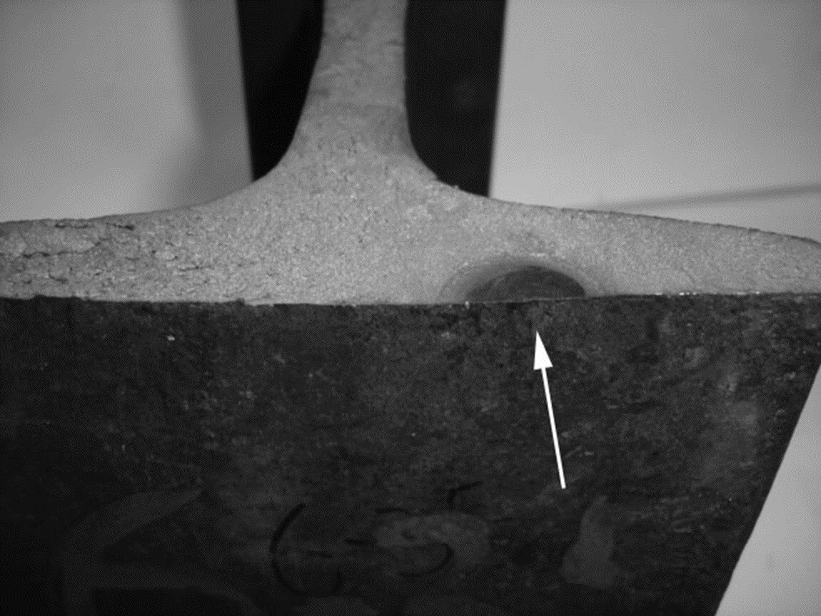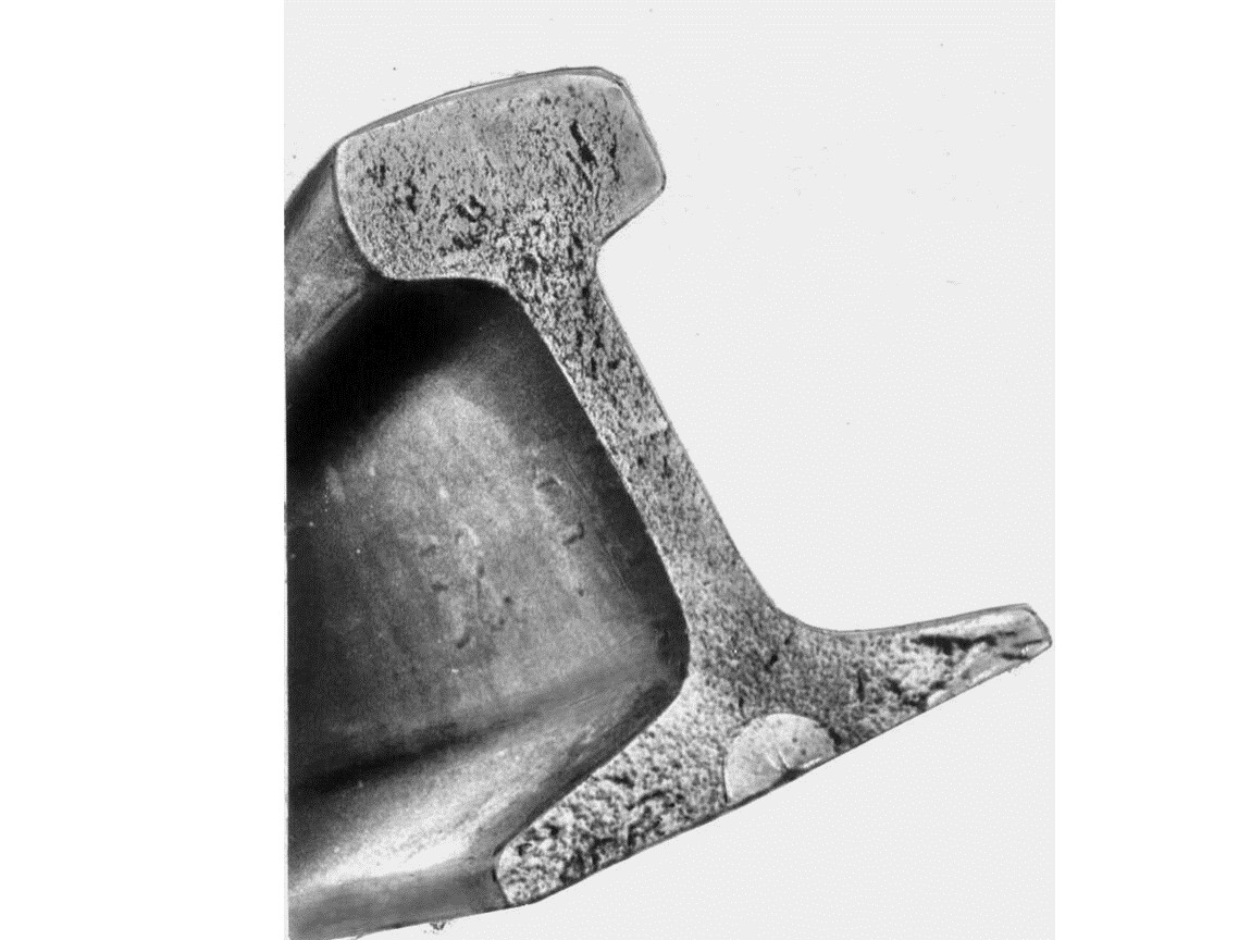 Своевременно не обнаруженные трещины дефектов 20.1-2, 60.1-2 могут привести к излому рельса. Характерный вид излома из-за дефекта 60.1-2 – ласточкин хвост.