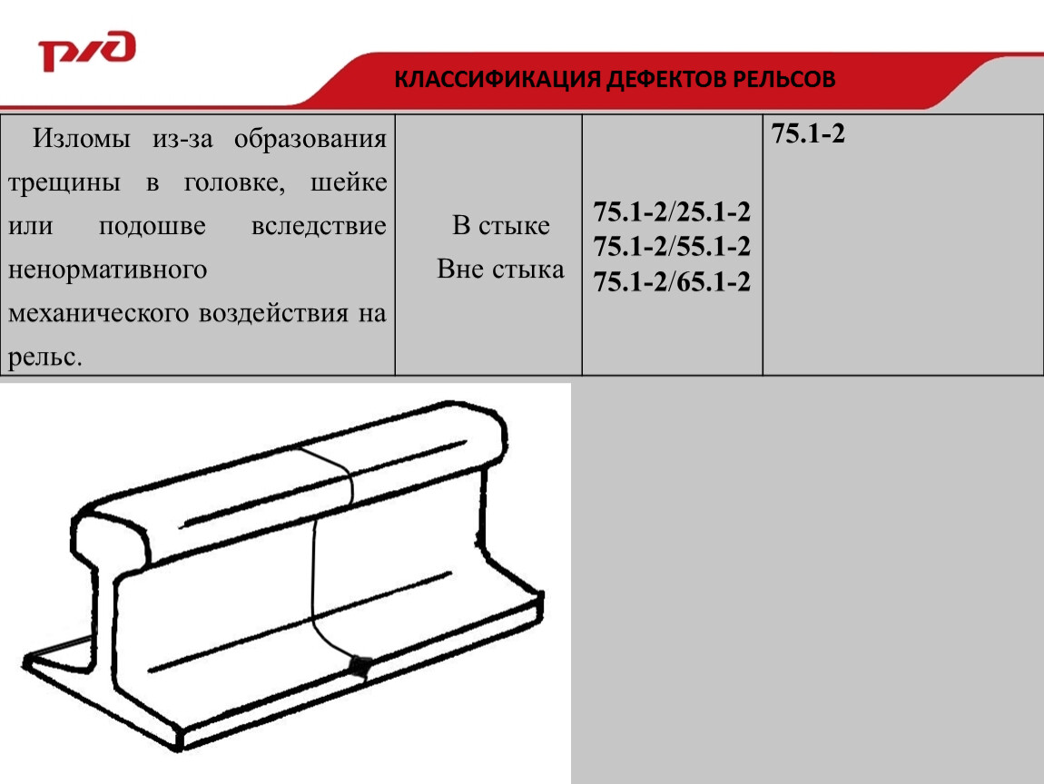 Изломы из-за образования трещины в головке, шейке или подошве вследствие ненормативного механического воздействия на рельс. | В стыке | 75.1-2/25.1-2 | 75.1-2 |
