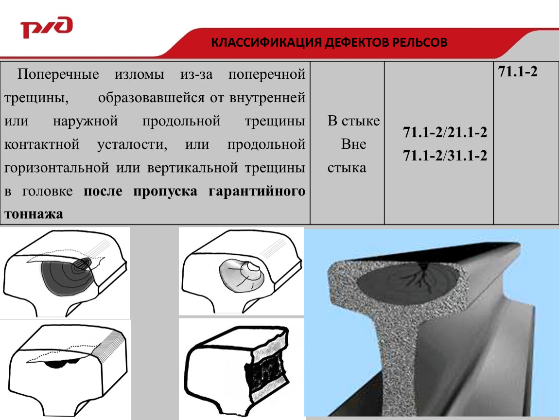 Поперечные изломы из-за поперечной трещины, образовавшейся от внутренней или наружной продольной трещины контактной усталости, или продольной горизонтальной или вертикальной трещины в головке после пропуска гарантийного тоннажа | В стыке | 71.1-2/21.1-2 | 71.1-2 |