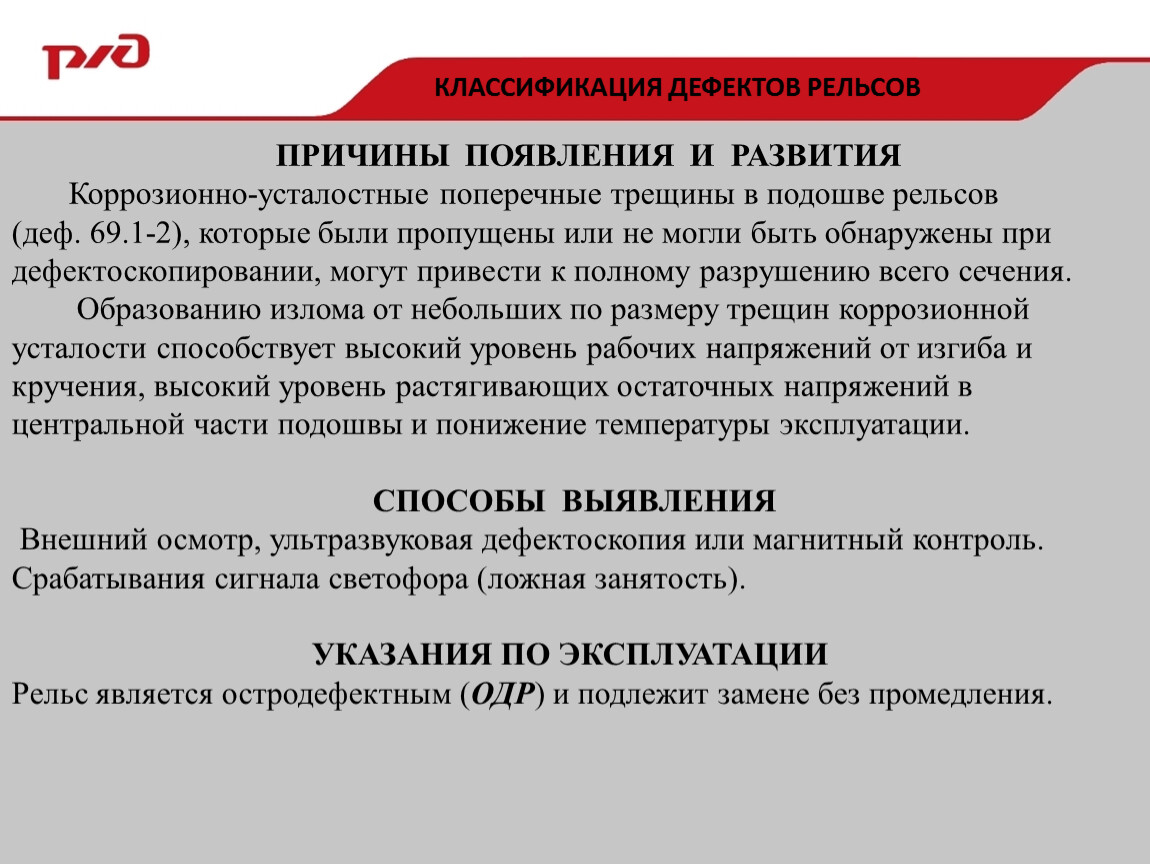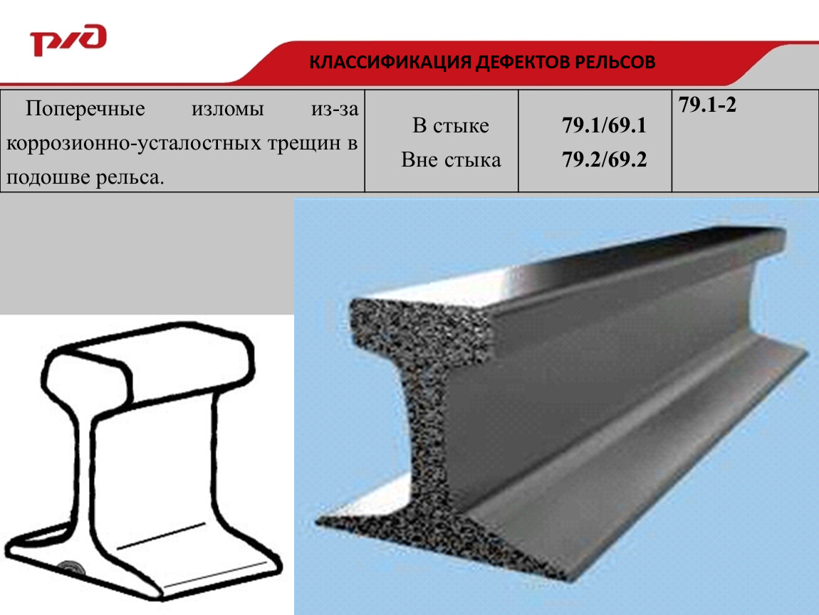 Коррозионно-усталостные поперечные трещины в подошве рельсов (деф. 69.1-2), которые были пропущены или не могли быть обнаружены при дефектоскопировании, могут привести к полному разрушению всего сечения.