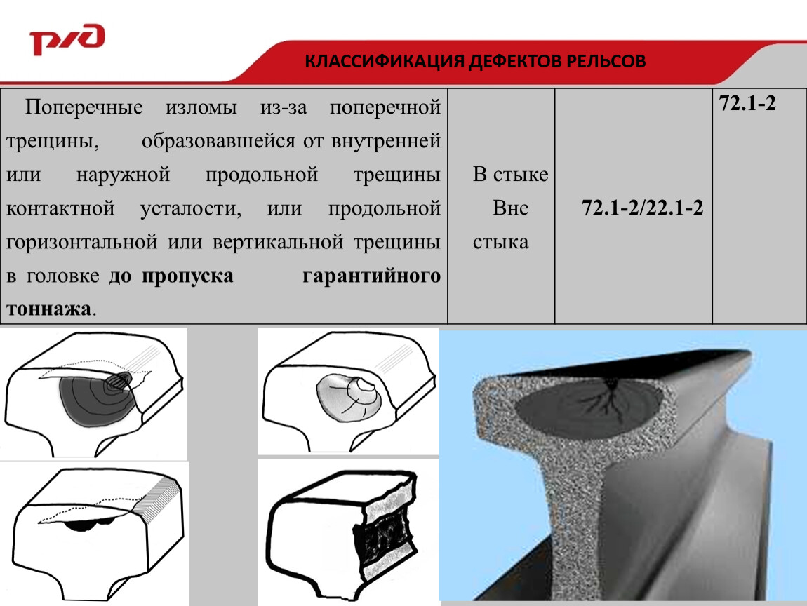 Поперечные изломы из-за поперечной трещины, образовавшейся от внутренней или наружной продольной трещины контактной усталости, или продольной горизонтальной или вертикальной трещины в головке до пропуска гарантийного тоннажа. | В стыке | 72.1-2/22.1-2 | 72.1-2 |