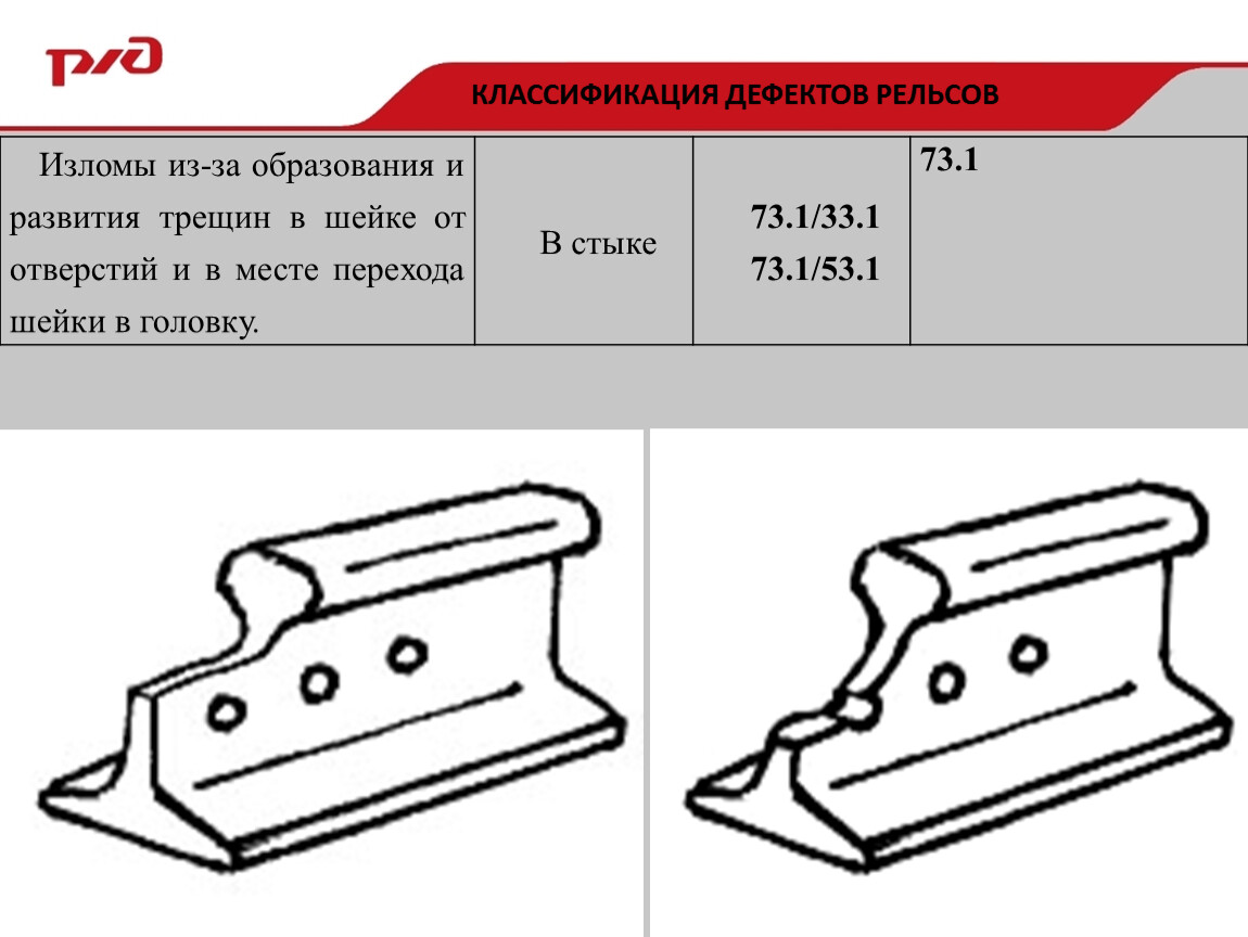 Изломы из-за образования и развития трещин в шейке от отверстий и в месте перехода шейки в головку. | В стыке | 73.1/33.1 | 73.1 |