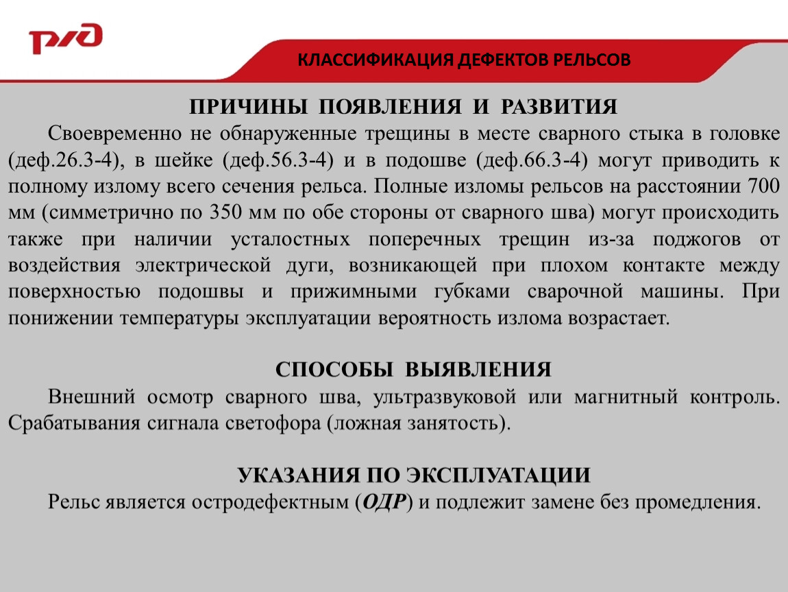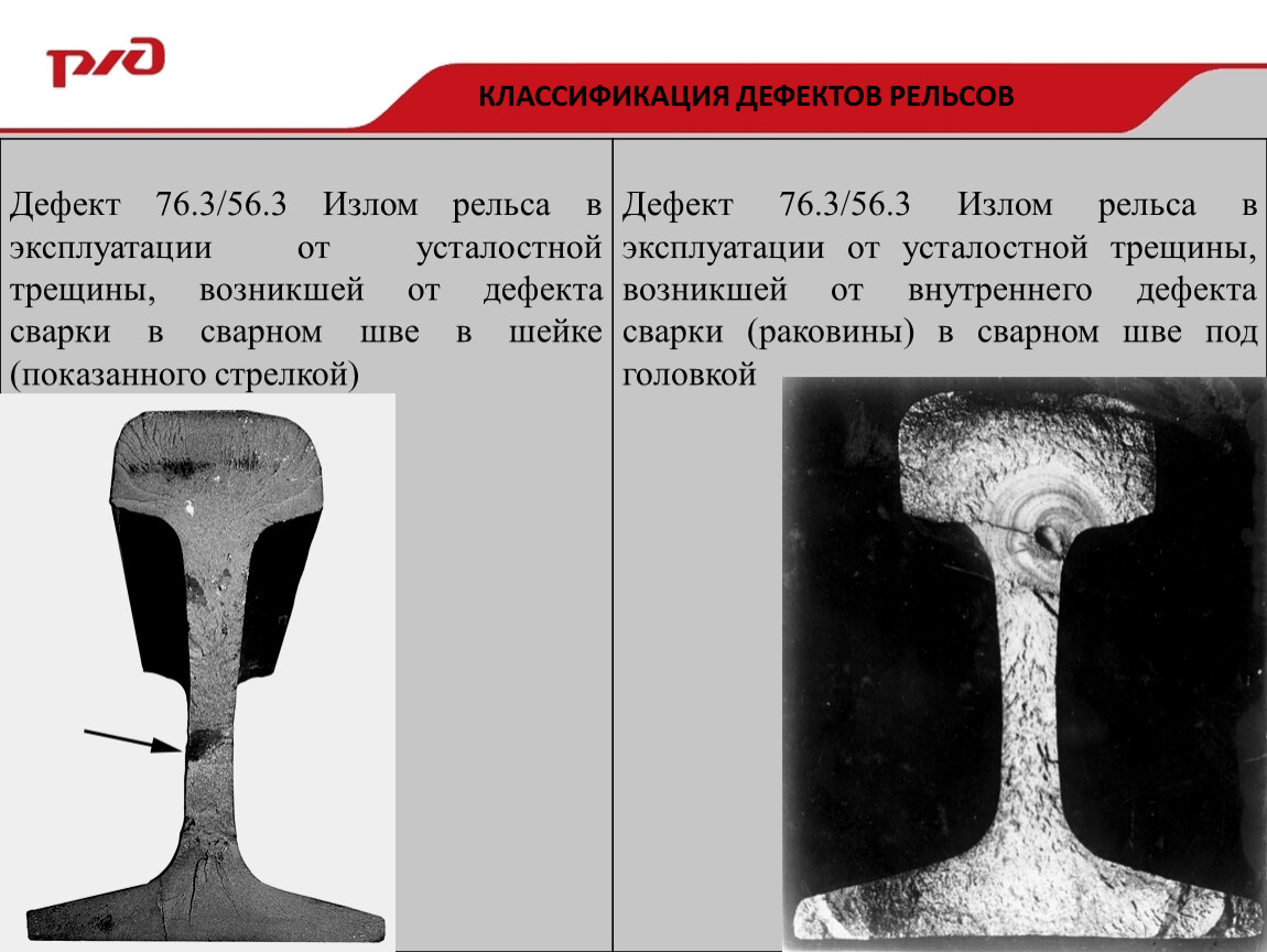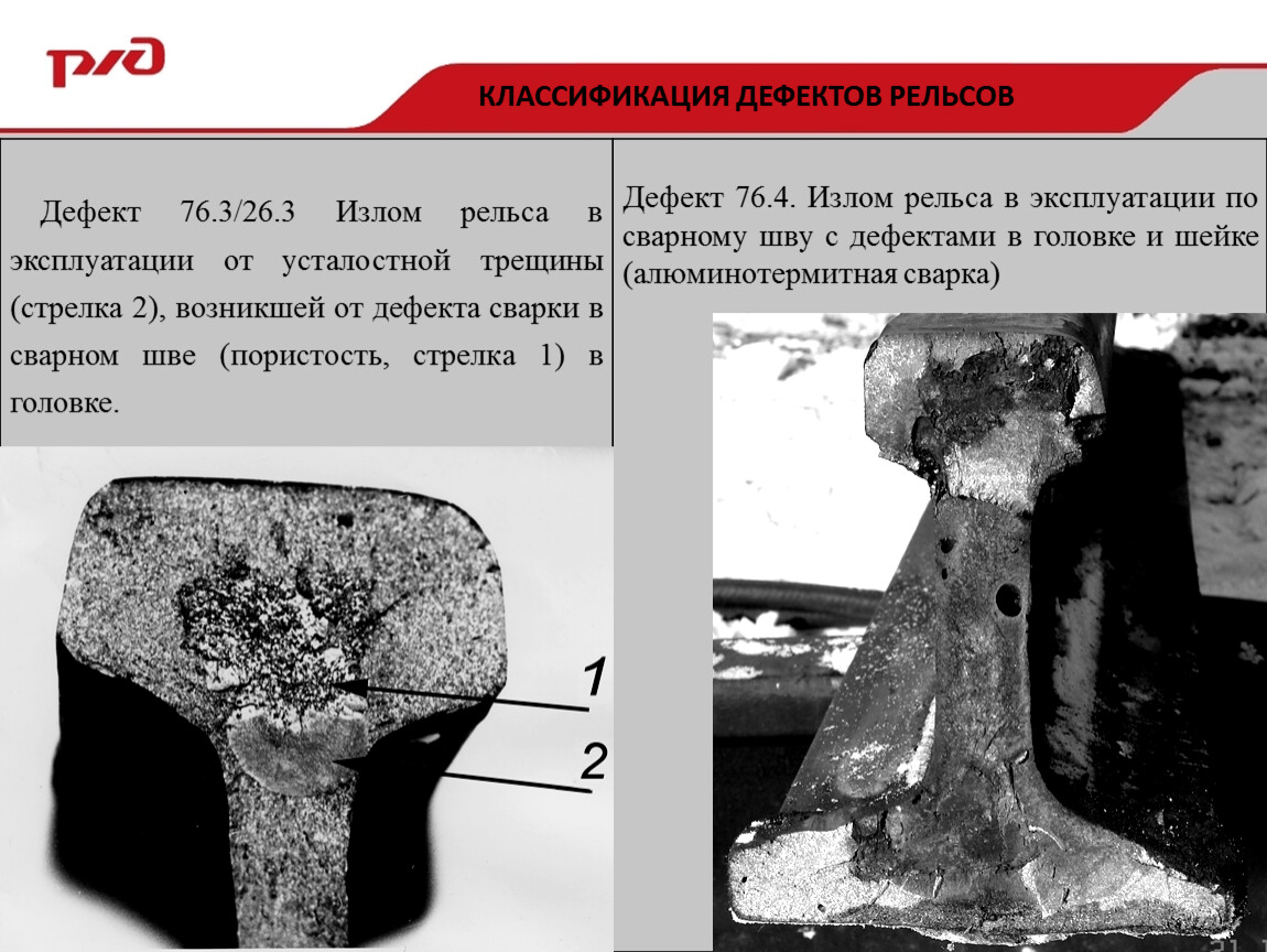 Своевременно не обнаруженные трещины в месте сварного стыка в головке (деф.26.3-4), в шейке (деф.56.3-4) и в подошве (деф.66.3-4) могут приводить к полному излому всего сечения рельса. Полные изломы рельсов на расстоянии 700 мм (симметрично по 350 мм по обе стороны от сварного шва) могут происходить также при наличии усталостных поперечных трещин из-за поджогов от воздействия электрической дуги, возникающей при плохом контакте между поверхностью подошвы и прижимными губками сварочной машины. При понижении температуры эксплуатации вероятность излома возрастает.