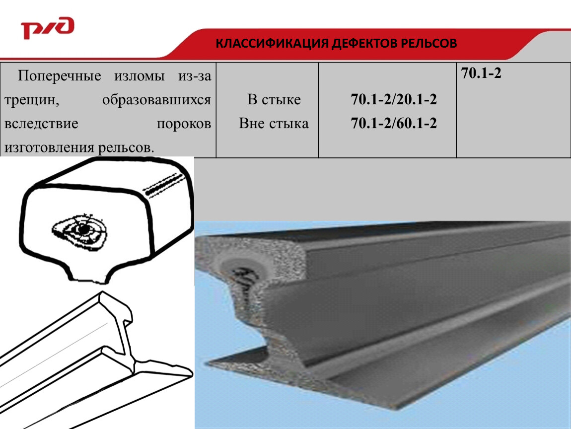 Поперечные изломы из-за трещин, образовавшихся вследствие пороков изготовления рельсов. | В стыке | 70.1-2/20.1-2 | 70.1-2 |