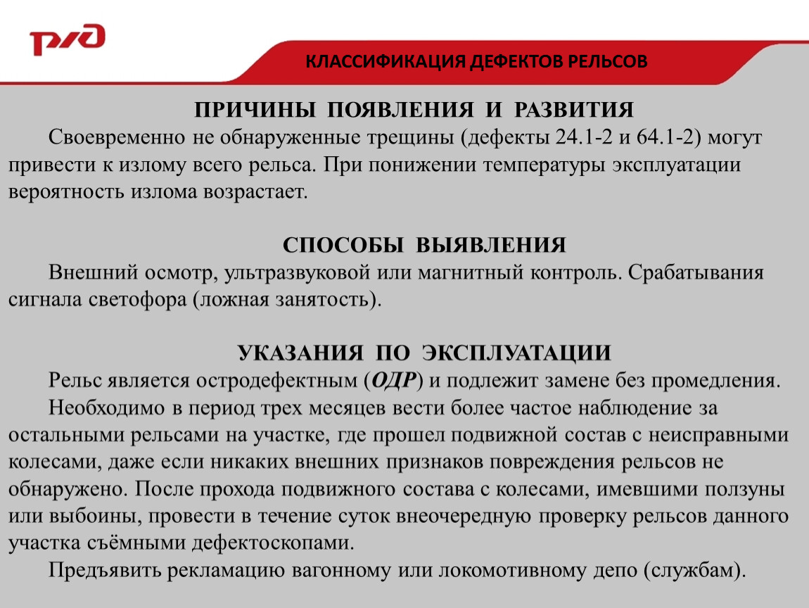 Своевременно не обнаруженные трещины (дефекты 24.1-2 и 64.1-2) могут привести к излому всего рельса. При понижении температуры эксплуатации вероятность излома возрастает.