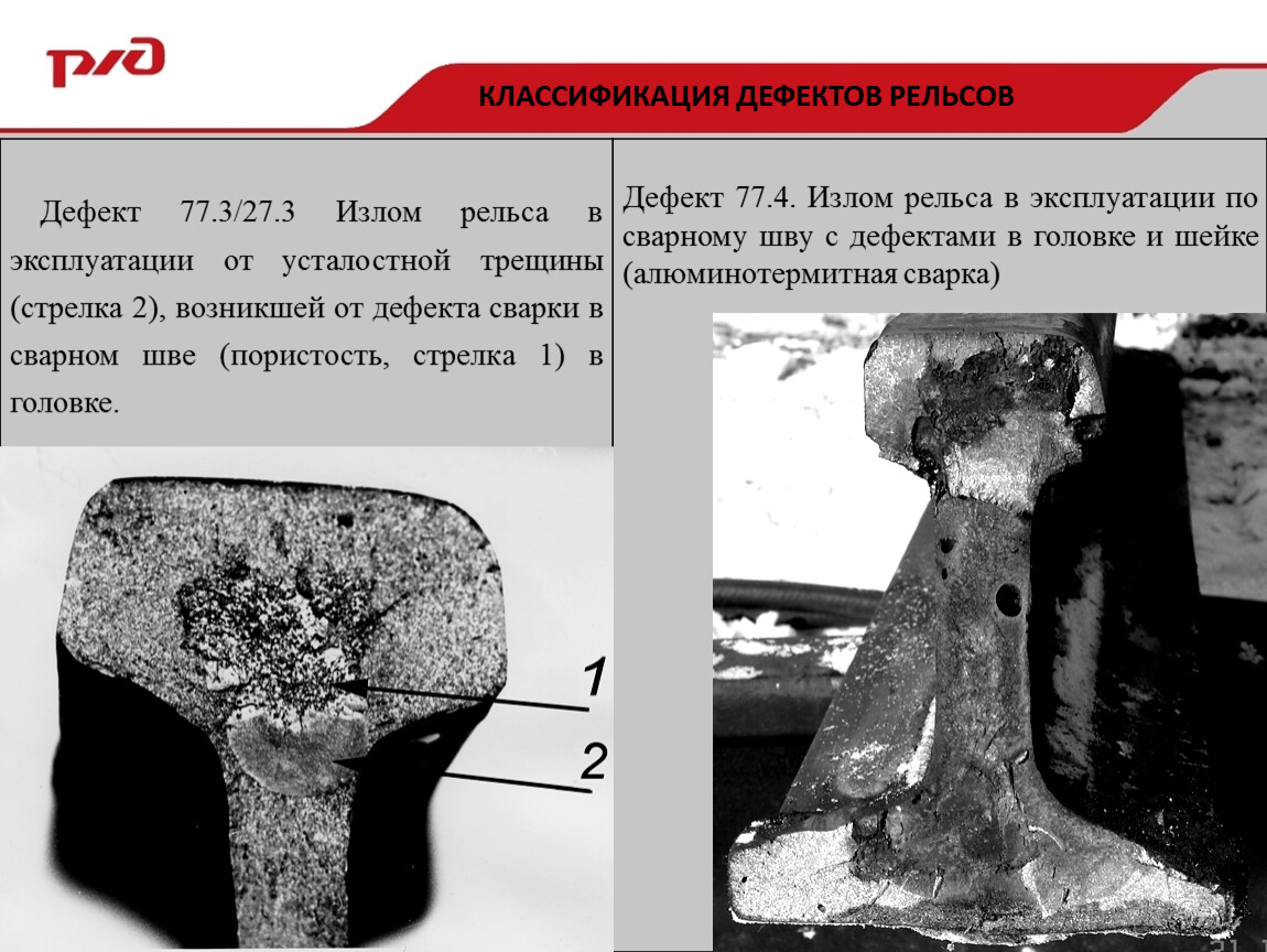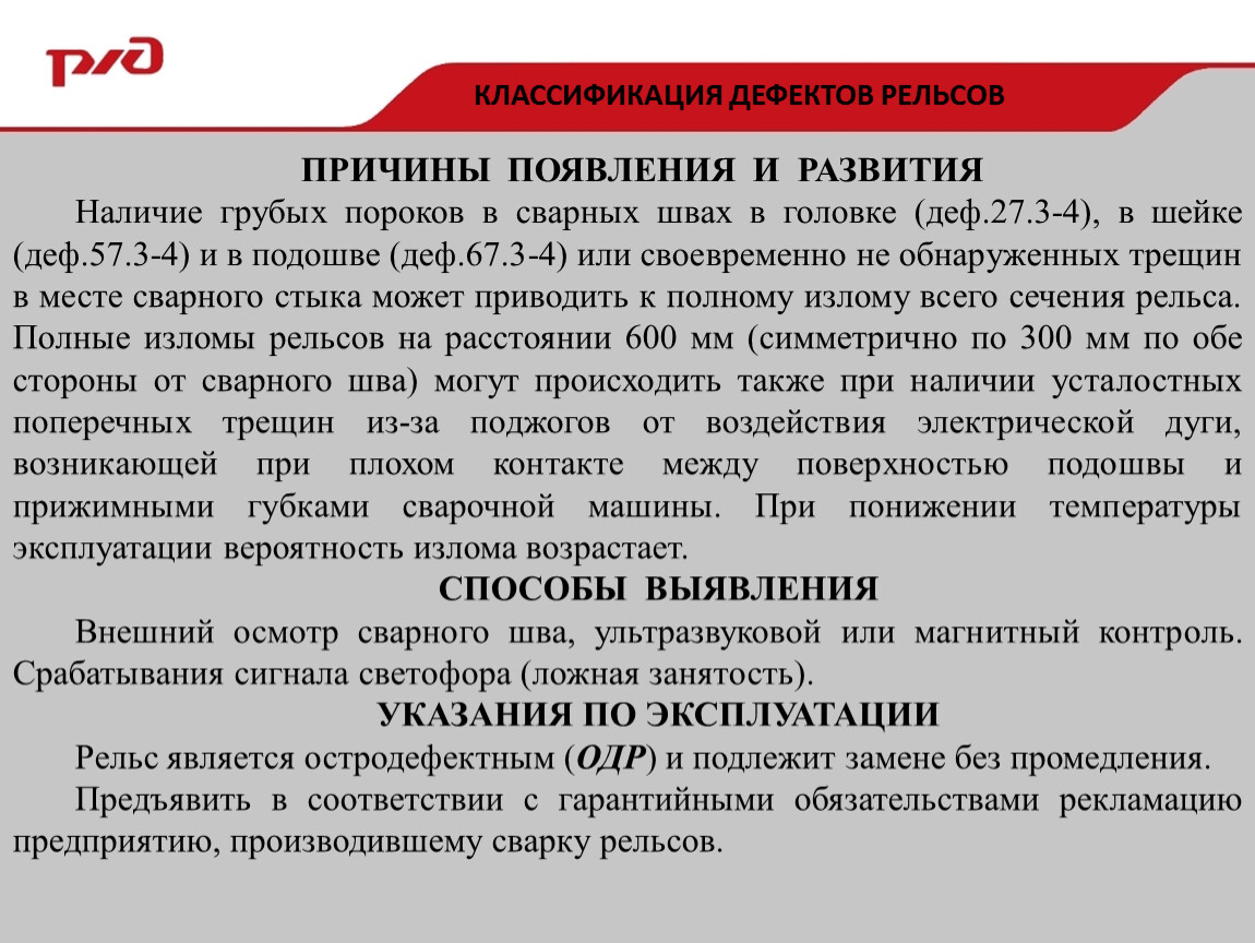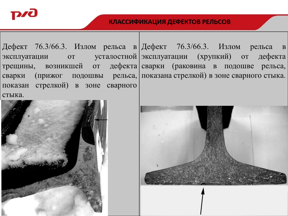 Наличие грубых пороков в сварных швах в головке (деф.27.3-4), в шейке (деф.57.3-4) и в подошве (деф.67.3-4) или своевременно не обнаруженных трещин в месте сварного стыка может приводить к полному излому всего сечения рельса. Полные изломы рельсов на расстоянии 600 мм (симметрично по 300 мм по обе стороны от сварного шва) могут происходить также при наличии усталостных поперечных трещин из-за поджогов от воздействия электрической дуги, возникающей при плохом контакте между поверхностью подошвы и прижимными губками сварочной машины. При понижении температуры эксплуатации вероятность излома возрастает.