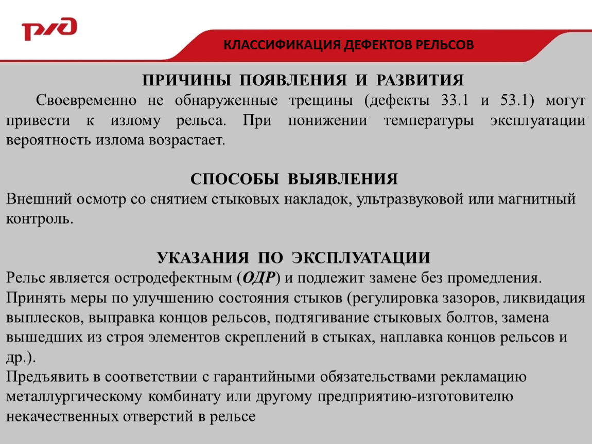 Своевременно не обнаруженные трещины (дефекты 33.1 и 53.1) могут привести к излому рельса. При понижении температуры эксплуатации вероятность излома возрастает.