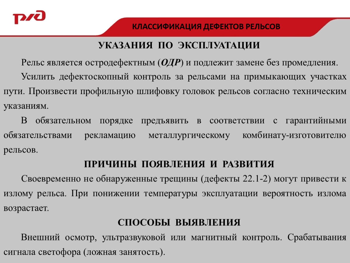 Своевременно не обнаруженные трещины (дефекты 22.1-2) могут привести к излому рельса. При понижении температуры эксплуатации вероятность излома возрастает.