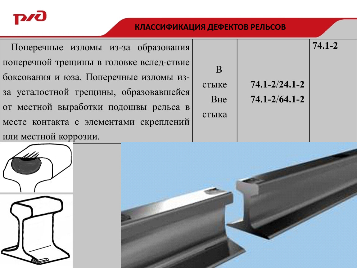 Поперечные изломы из-за образования поперечной трещины в головке вслед-ствие боксования и юза. Поперечные изломы из-за усталостной трещины, образовавшейся от местной выработки подошвы рельса в месте контакта с элементами скреплений или местной коррозии. | В стыке | 74.1-2/24.1-2 | 74.1-2 |