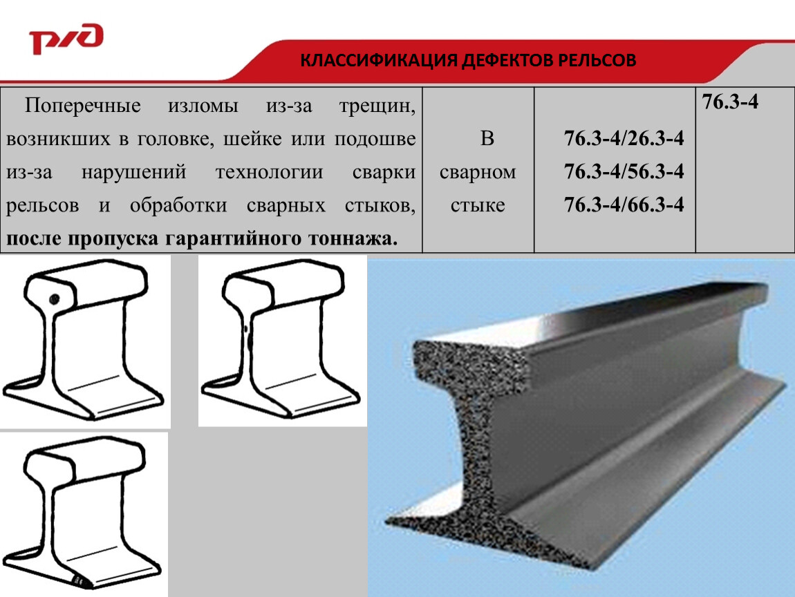 Поперечные изломы из-за трещин, возникших в головке, шейке или подошве из-за нарушений технологии сварки рельсов и обработки сварных стыков, после пропуска гарантийного тоннажа. | В сварном стыке | 76.3-4/26.3-4 | 76.3-4 |