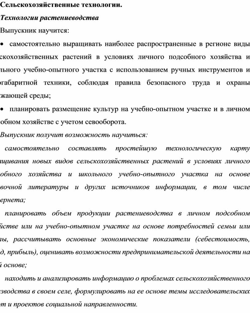 · самостоятельно выращивать наиболее распространенные в регионе виды сельскохозяйственных растений в условиях личного подсобного хозяйства и школьного учебно-опытного участка с использованием ручных инструментов и малогабаритной техники, соблюдая правила безопасного труда и охраны окружающей среды;