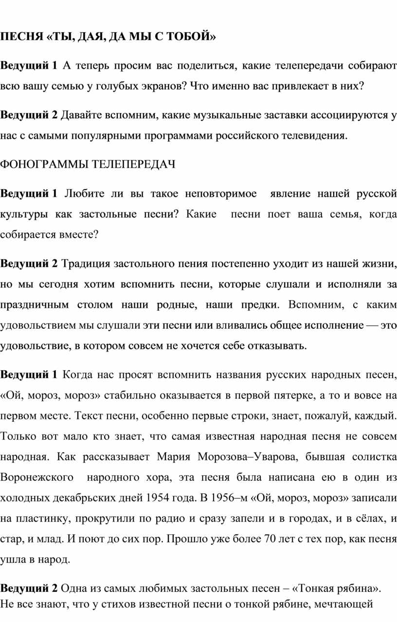 Ведущий 1 Когда нас просят вспомнить названия русских народных песен, «Ой, мороз, мороз» стабильно оказывается в первой пятерке, а то и вовсе на первом месте. Текст песни, особенно первые строки, знает, пожалуй, каждый. Только вот мало кто знает, что самая известная народная песня не совсем народная. Как рассказывает Мария Морозова–Уварова, бывшая солистка Воронежского народного хора, эта песня была написана ею в один из холодных декабрьских дней 1954 года. В 1956–м «Ой, мороз, мороз» записали на пластинку, прокрутили по радио и сразу запели и в городах, и в сёлах, и стар, и млад. И поют до сих пор. Прошло уже более 70 лет с тех пор, как песня ушла в народ.