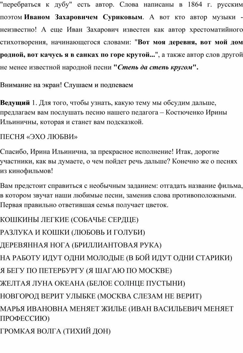 Ведущий 2 Одна из самых любимых застольных песен – «Тонкая рябина». Не все знают, что у стихов известной песни о тонкой рябине, мечтающей "перебраться к дубу" есть автор. Слова написаны в 1864 г. русским поэтом Иваном Захаровичем Суриковым. А вот кто автор музыки - неизвестно! А еще Иван Захарович известен как автор хрестоматийного стихотворения, начинающегося словами: "Вот моя деревня, вот мой дом родной, вот качусь я в санках по горе крутой...", а также автор слов другой не менее известной народной песни "Степь да степь кругом".