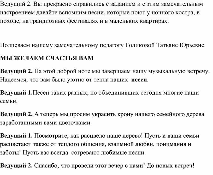 Ведущий 1. Посмотрите, как расцвело наше дерево! Пусть и ваши семьи расцветают также от теплого общения, взаимной любви, понимания и заботы! Пусть вас всегда согревают любимые песни.