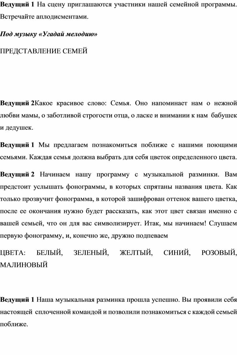 Ведущий 1 Мы предлагаем познакомиться поближе с нашими поющими семьями. Каждая семья должна выбрать для себя цветок определенного цвета.