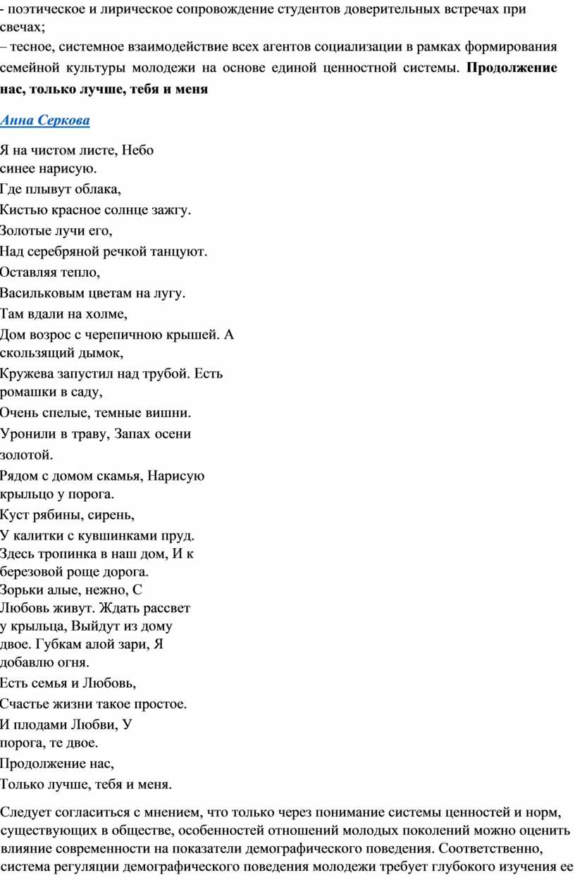 Следует согласиться с мнением, что только через понимание системы ценностей и норм, существующих в обществе, особенностей отношений молодых поколений можно оценить влияние современности на показатели демографического поведения. Соответственно, система регуляции демографического поведения молодежи требует глубокого изучения ее ценностного мира и в определенной степени его регулирования через каналы социализации, которые призваны формировать в ряду прочих значимых ценностей и установок молодежи семейные ценности и ориентации посредством формирования ее семейной культуры.