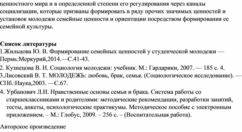 1.Жильцова Ю. В. Формирование семейных ценностей у студенческой молодежи — Пермь:Меркурий,2014.—С.41-43.