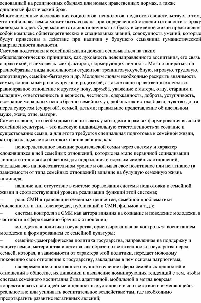 Многочисленные исследования социологов, психологов, педагогов свидетельствует о том, что стабильная семья может быть создана при определенной степени готовности к браку молодых людей. Содержание готовности личности к браку и семейной жизни представляет собой комплекс общетеоретических и специальных знаний, совокупность умений, которые будут приведены в действие при наличии у будущего семьянина гуманистической направленности личности.