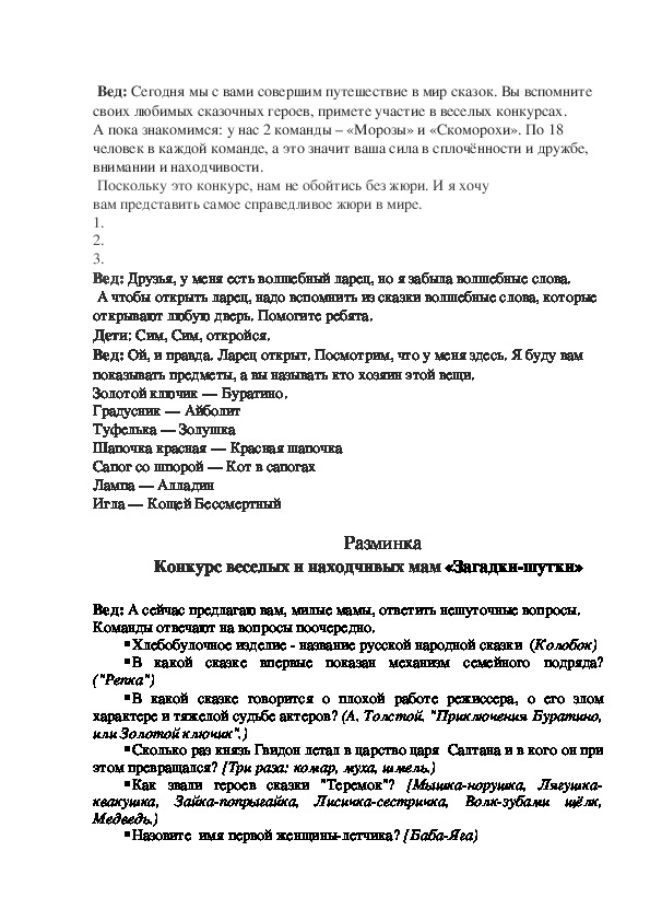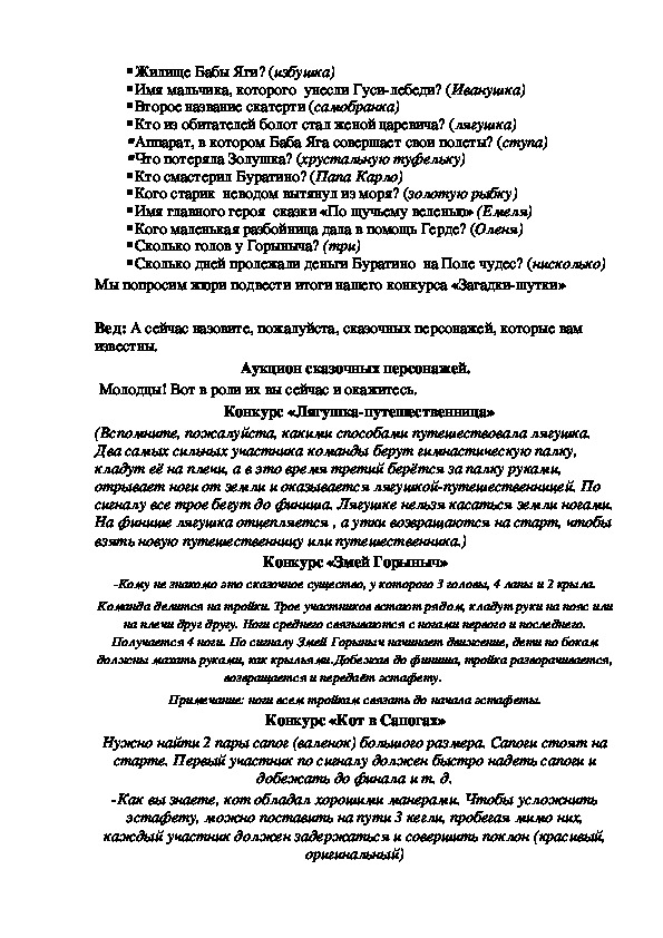 Вед: А сейчас назовите, пожалуйста, сказочных персонажей, которые вам