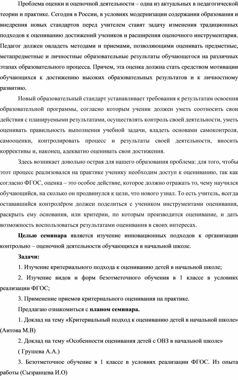 Целью семинара является изучение инновационных подходов к организации контрольно – оценочной деятельности обучающихся в начальной школе.