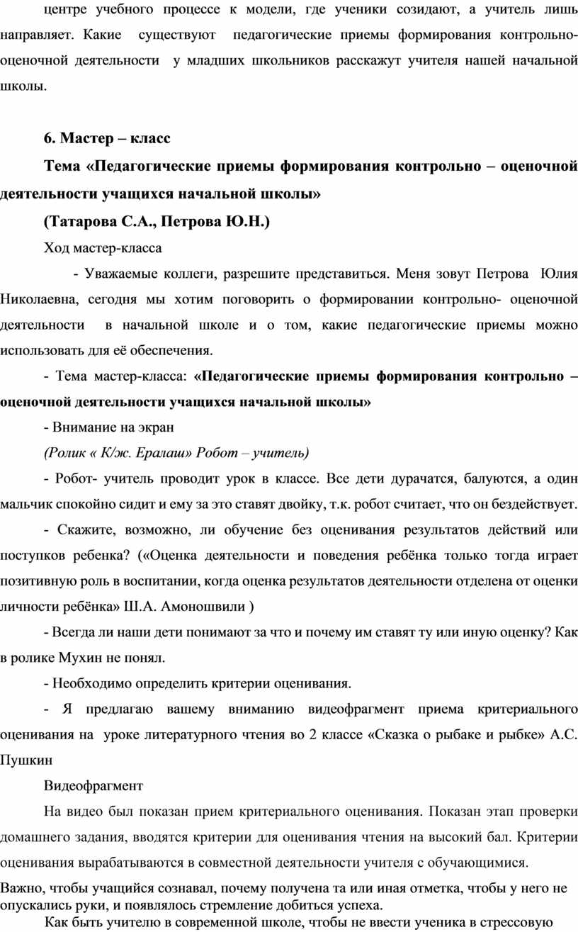 5. Мастер – класс на тему «Педагогические приёмы формирование контрольно-оценочной деятельности учащихся начальной школы» (Татарова С.А., Петрова Ю.Н.)