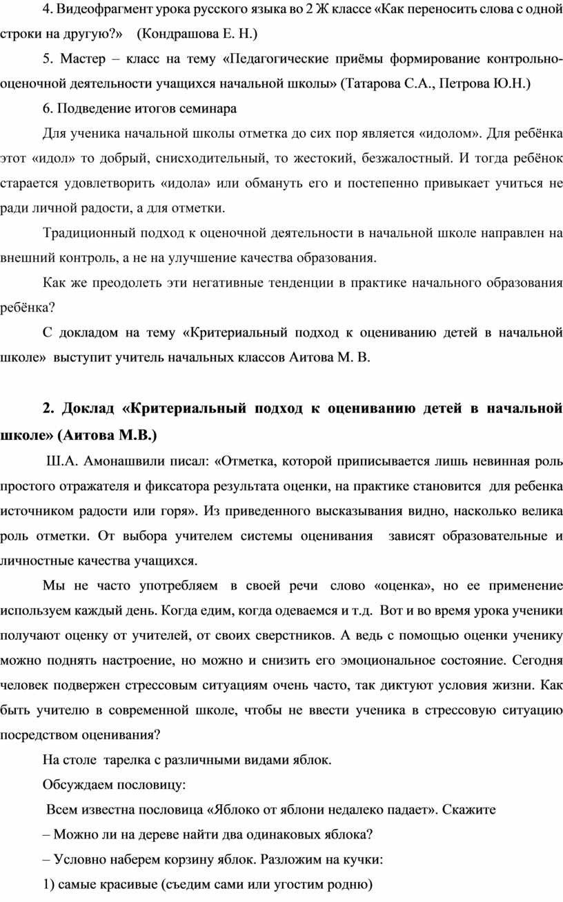 1. Доклад на тему «Критериальный подход к оцениванию детей в начальной школе» (Аитова М.В)