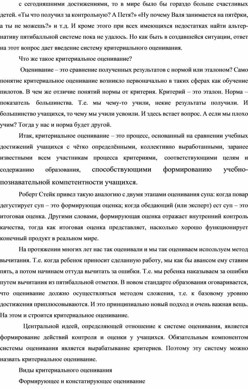 Дети приходят в школу очень разные, но все они получили установку на то, что в школе их ждут новые знания, открытия. И у каждого ребёнка продвижение по этому пути индивидуальное. Успешность в школьников должна определяться не наличием пресловутых «5» и «4», а личной динамикой развития и желанием учиться. Если бы мы, взрослые, не сравнивали своих детей между собой, а сравнивали бы вчерашние результаты с сегодняшними достижениями, то в мире было бы гораздо больше счастливых детей. «Ты что получил за контрольную? А Петя?» «Ну почему Валя занимается на пятёрки, а ты не можешь?» и т.д. И кроме этого при всех имеющихся недостатках найти альтернативу пятибалльной системе пока не удалось. Но как быть в создавшейся ситуации, ответ на этот вопрос дает введение систему критериального оценивания.