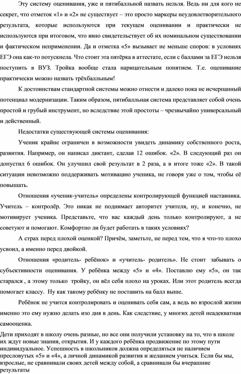 Эту систему оценивания, уже и пятибалльной назвать нельзя. Ведь ни для кого не секрет, что отметок «1» и «2» не существует – это просто маркеры неудовлетворительного результата, которые используются при текущем оценивании и практически не используются при итоговом, что явно свидетельствует об их номинальном существовании и фактическом неприменении. Да и отметка «5» вызывает не меньше споров: в условиях ЕГЭ она как-то потускнела. Что стоит эта пятёрка в аттестате, если с баллами за ЕГЭ нельзя поступить в ВУЗ. Тройка вообще стала нарицательным понятием. Т.е. оценивание практически можно назвать трёхбалльным!