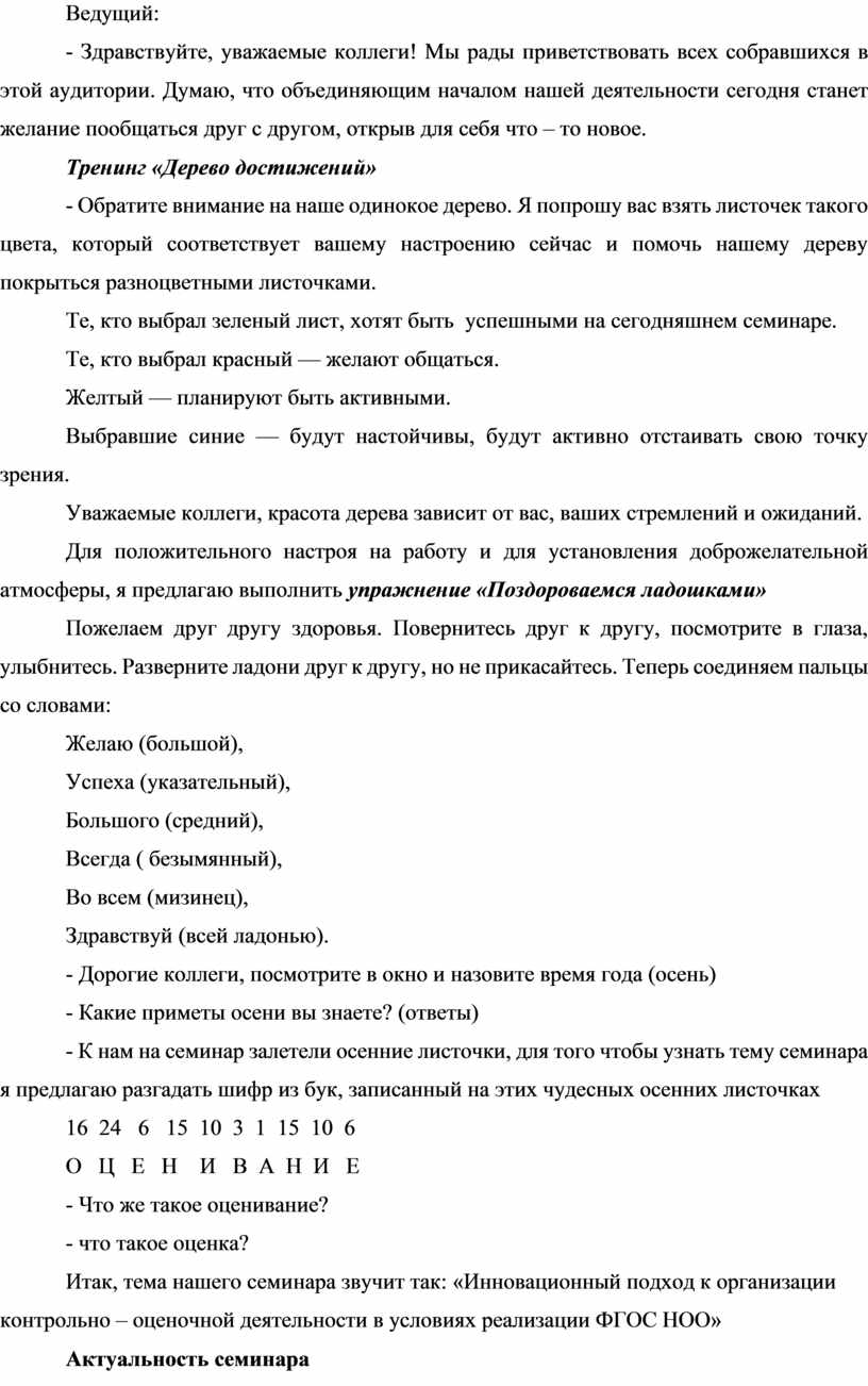 Итак, тема нашего семинара звучит так: «Инновационный подход к организации контрольно – оценочной деятельности в условиях реализации ФГОС НОО»