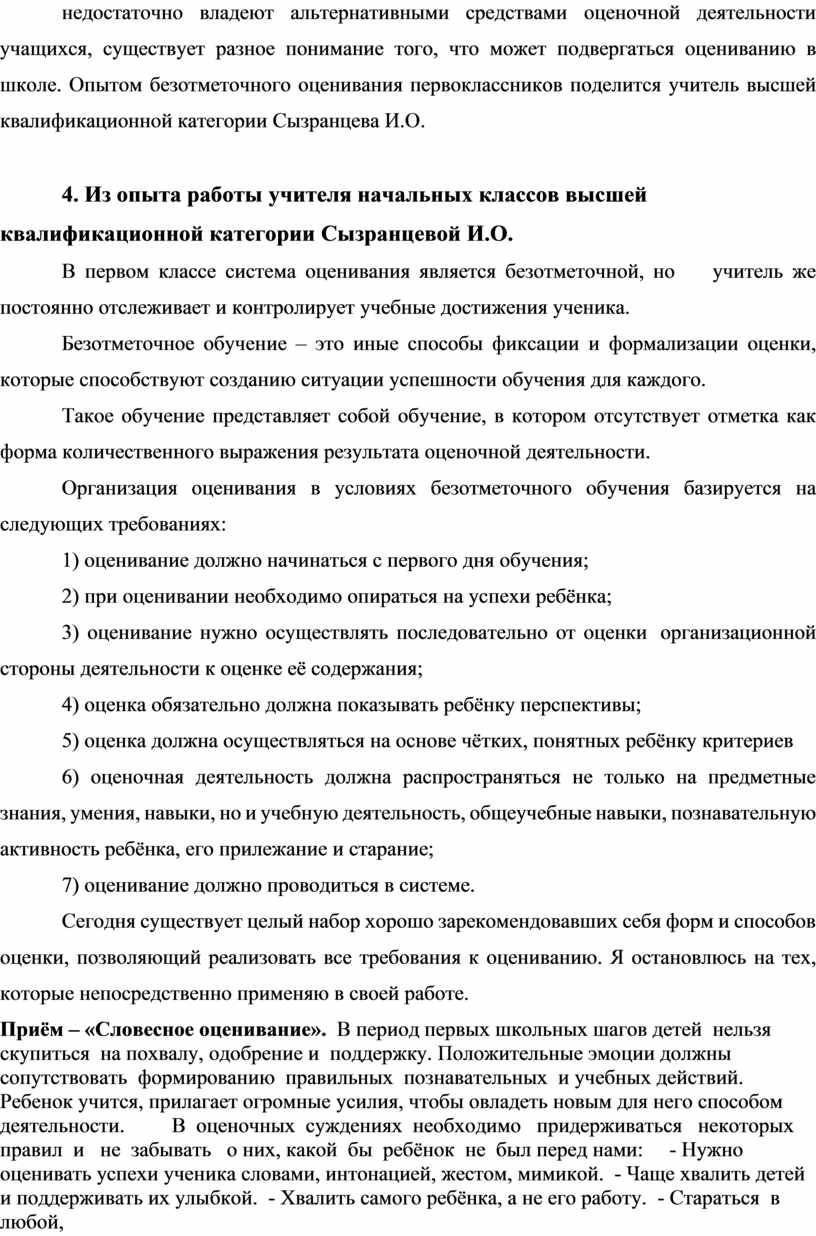 4. Безотметочное обучение в 1 классе в условиях реализации ФГОС. Из опыта работы (Сызранцева И.О.)