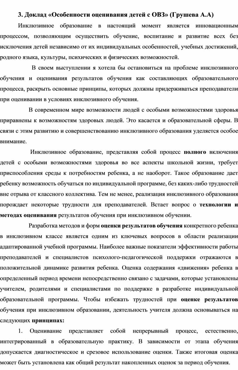 3. Доклад на тему «Особенности оценивания детей с ОВЗ в начальной школе» ( Грушева А.А.)