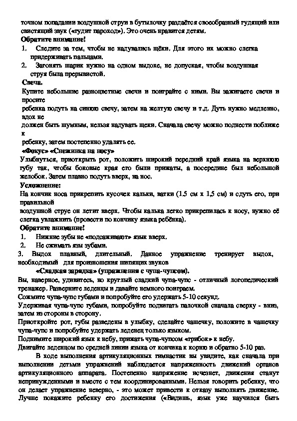 Цель данной работы - оказание помощи родителям в овладении основными приемами артикуляционной моторики ребенка в домашних условиях
