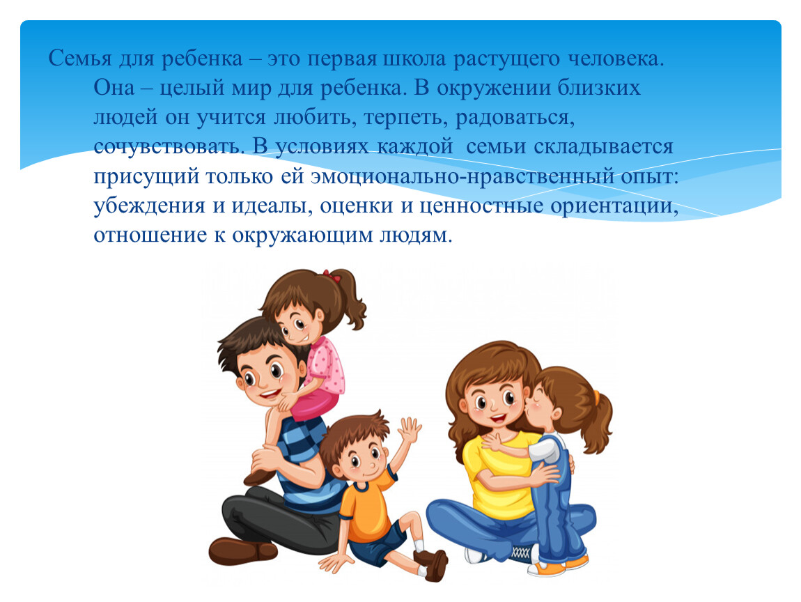 Семья для ребенка – это первая школа растущего человека. Она – целый мир для ребенка. В окружении близких людей он учится любить, терпеть, радоваться, сочувствовать. В условиях каждой семьи складывается присущий только ей эмоционально-нравственный опыт: убеждения и идеалы, оценки и ценностные ориентации, отношение к окружающим людям.